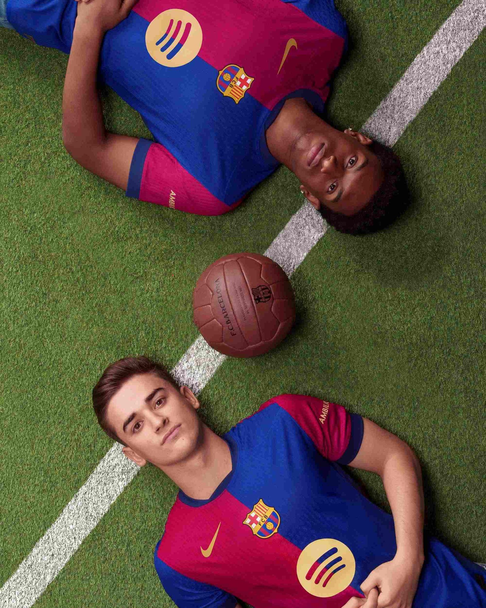 The cheap 2024-25 home authentic FC Barcelona jersey has just two blue and maroon stripes, with the FC Barcelona crest connecting them in the middle, while the sleeves feature corresponding blue and maroon colours. The brand logo and Spotify logo are both rendered in gold, while Catalan colors are visible on the back of the collar. The new authentic Barcelona jersey 2024 marks the club's 125th anniversary.