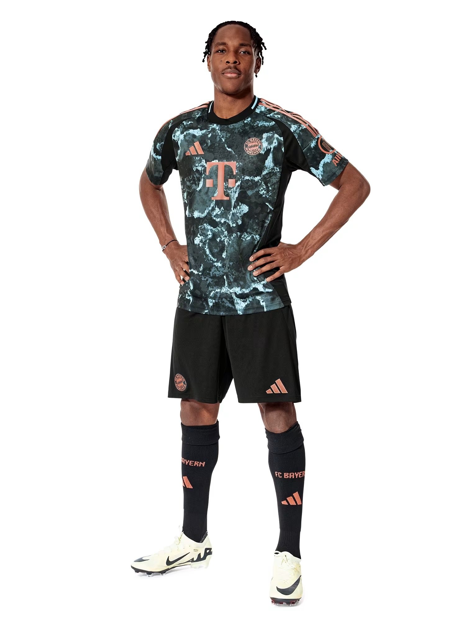 The Bayern Munich Jersey Away 2024/25 is inspired by the famous and iconic Bavaria statue. Draped in a bear skin, holding aloft a wreath of oak trees and flanked by a lion, the statue is a female incarnation of Germany's largest state, standing 18 meters (60 feet) tall and weighing 87 tons. The black base is covered with a mottled pattern of white and aged turquoise running through the Bayern Munich jersey, and the players will firstly wear the new Bayern Munich jersey for the first time when they take on Tottenham Hotspur in the Audi Summer Tour match on August 3. The Bayern Munich jersey hasa bold design complementing with third color orange detailing to the shoulder and patch. What's more, the club motto "Mia San Mia" (We are who we are) is specially designed on the upper back, making this Bayern Munich camiseta futbol more memorable.